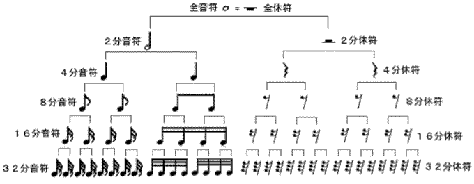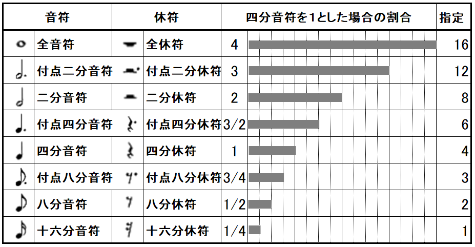 下記の表の「指定」の値を指定します。(例:四分音符・休符の場合は「4」