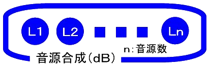 <計算式> 音源L1(dB)、音源L2(dB)、音源Ln(dB)の合成レベル(dB):合成Lgは以下の式に成ります。 ・合成Lg=10*log(P1+P2・・・Pn)、P1=10の(L1/10)乗、P2=10の(L2/10)乗、Pn=10の(Ln/10)乗 ・同じ音源であれば10Xlog(P*音源数)で計算する。