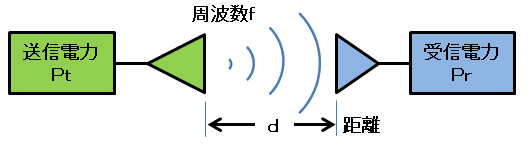送信アンテナからd離れた地点にある受信アンテナの電力密度Pdは Pd=Pt/(4πd)2(w/m2)となります。