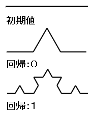左図の直線(初期値)を3等分し、真ん中の直線の端を頂点とする正三角形を描き、