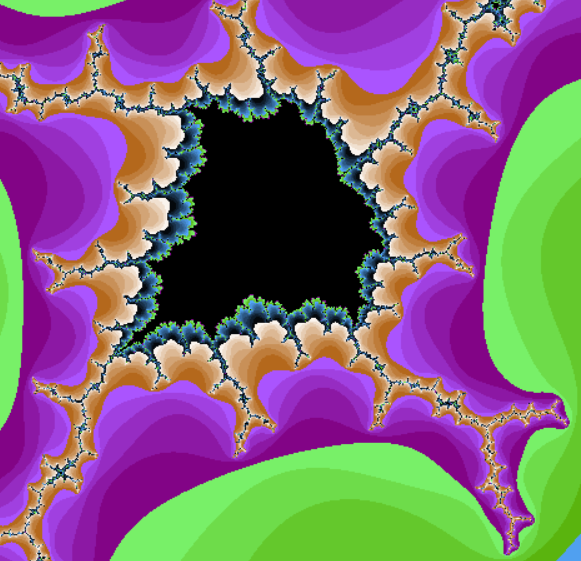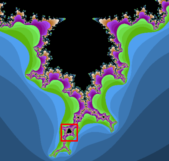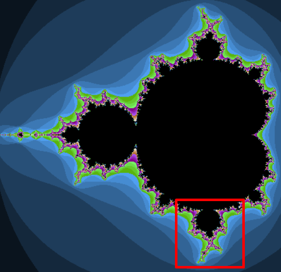 上図の黒く塗られた部分がマンデルブロー集合です。 その一部を拡大したものを真ん中の図、