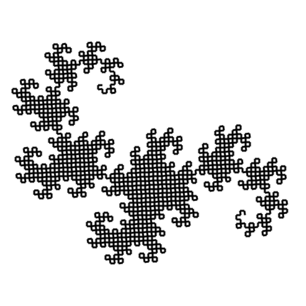 | 22 | ドラゴン曲線 | フラクタル図形の一種で、一本の直線を直角に交わる二本の直線に置き換えて これを再帰的に繰り返してできる図です。 中国風のドラゴン(竜)に似ているところから、この名称があります。 |