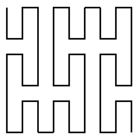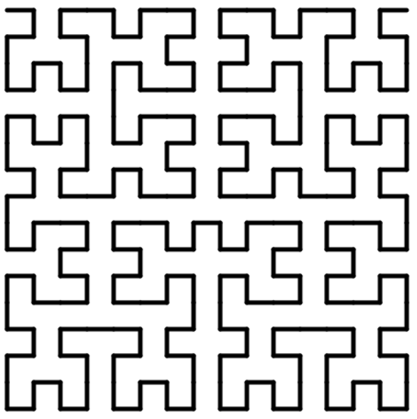| 27 | ヒルベルト曲線 | ヒルベルト曲線は、フラクタル図形の一つで、 平面や空間内の単位正方形、単位立方体を特定のパターンに乗っ取って 全て通るフラクタルな空間補充曲線の一つ.(一本の線で全部のブロックを通るようにする) 空間を覆い尽くす空間充填曲線の一つです。 |