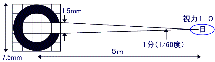 この時、太さ1.5mm、直径7.5mmのリングに設けられた、巾1.5mmの切り欠きの方向がわかる視力を1.0とします。
