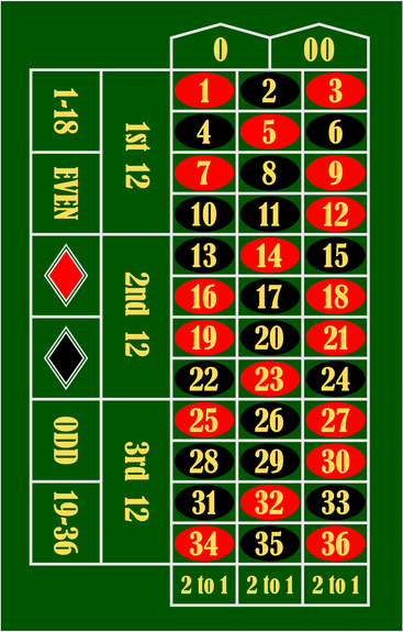 ②2数字賭ける(スプリット)【18倍】 ③3数字賭け(ストリート)【12倍】 0か00を含む場合はスペシャルストリート ④4数字賭け(コーナー)【9倍】 ⑤5数字賭け(ファーストアップ)【7倍】 ⑥6数字賭け(ラインペット)【6倍】 ⑦1~34縦一列に賭ける(ファースト・コラム)【3倍】 ⑧2~35縦一列に賭ける(セカンド・コラム)【3倍】 ⑨3~36縦一列に賭ける(サードト・コラム)【3倍】 ⑩1~12に賭ける(ファースト・ダズン)【3倍】 ⑪13~24(セカンド・ダズン)【3倍】 ⑫25~36に賭ける(サード・ダズン)【3倍】 ⑬1~18に賭ける(ローナンバー)【2倍】 ⑭偶数に賭ける(イーブン)【2倍】 ⑮赤に賭ける(レッドカラー)【2倍】 ⑯黒に賭ける(ブラックカラー)【2倍】 ⑰奇数に賭ける(オッド)【2倍】 ⑱19~36に賭ける(ハイナンバー)【2倍】